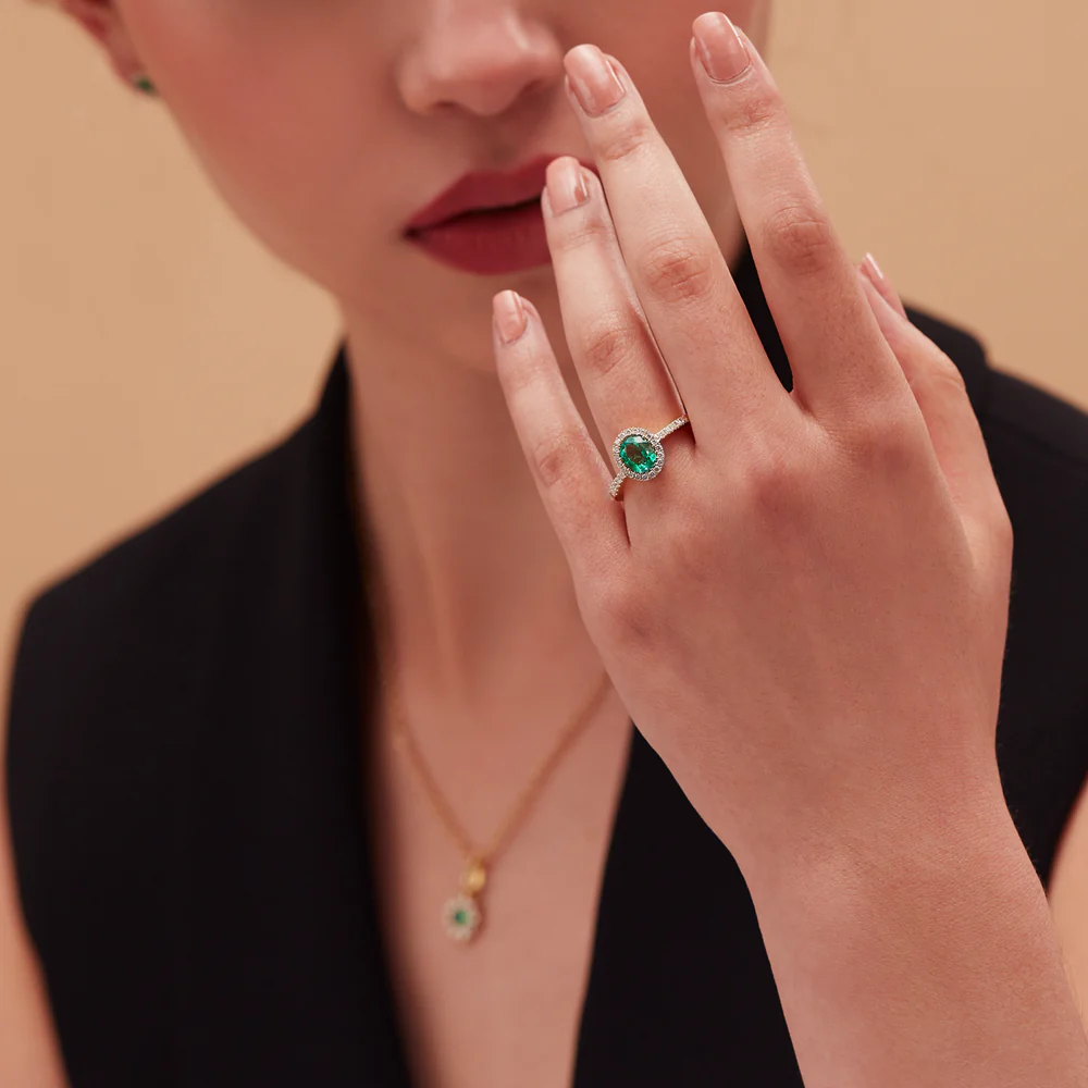 1 Natural Emerald – 0.80 carat weight, 15 Diamonds – 0.15 carat weight, 18K Rose Gold