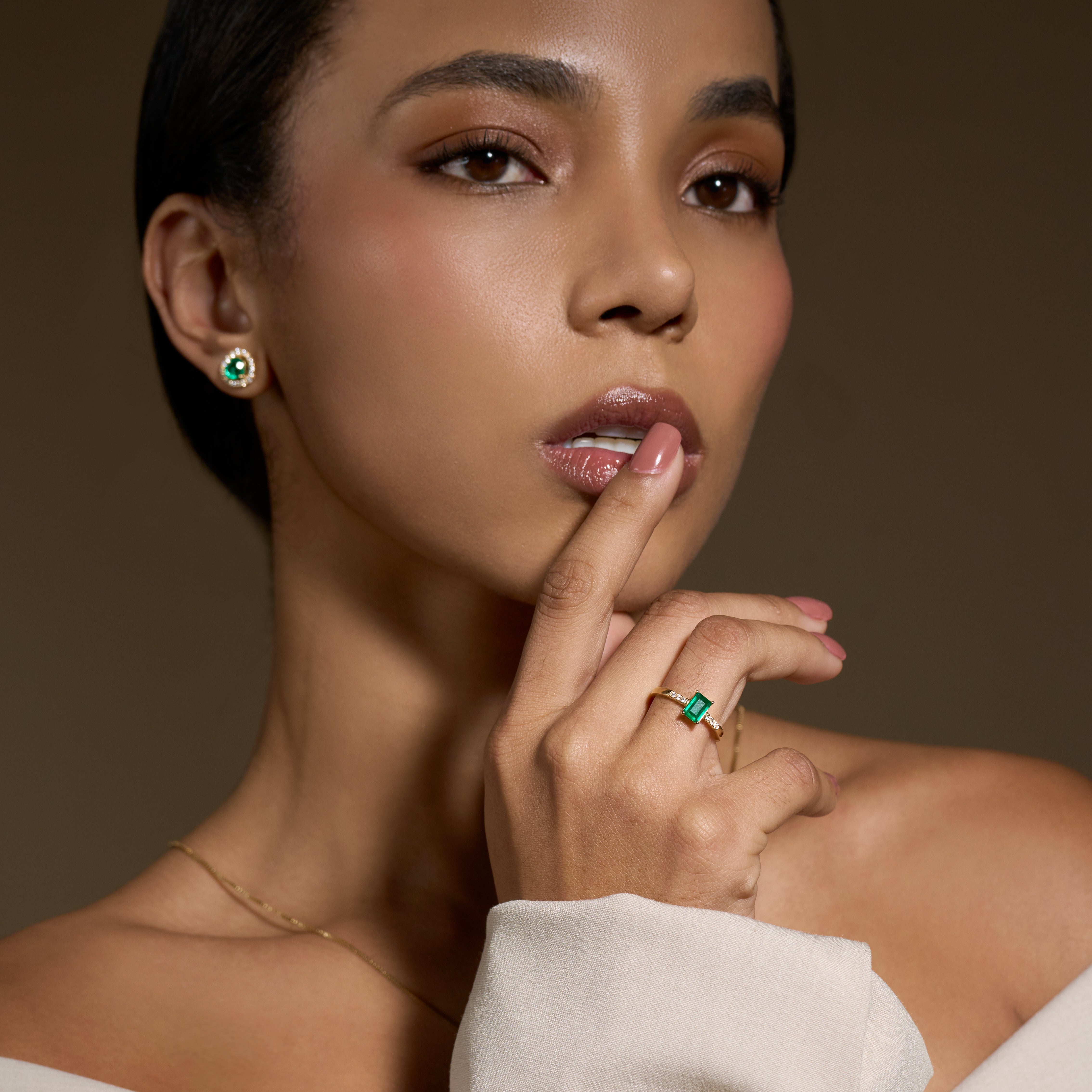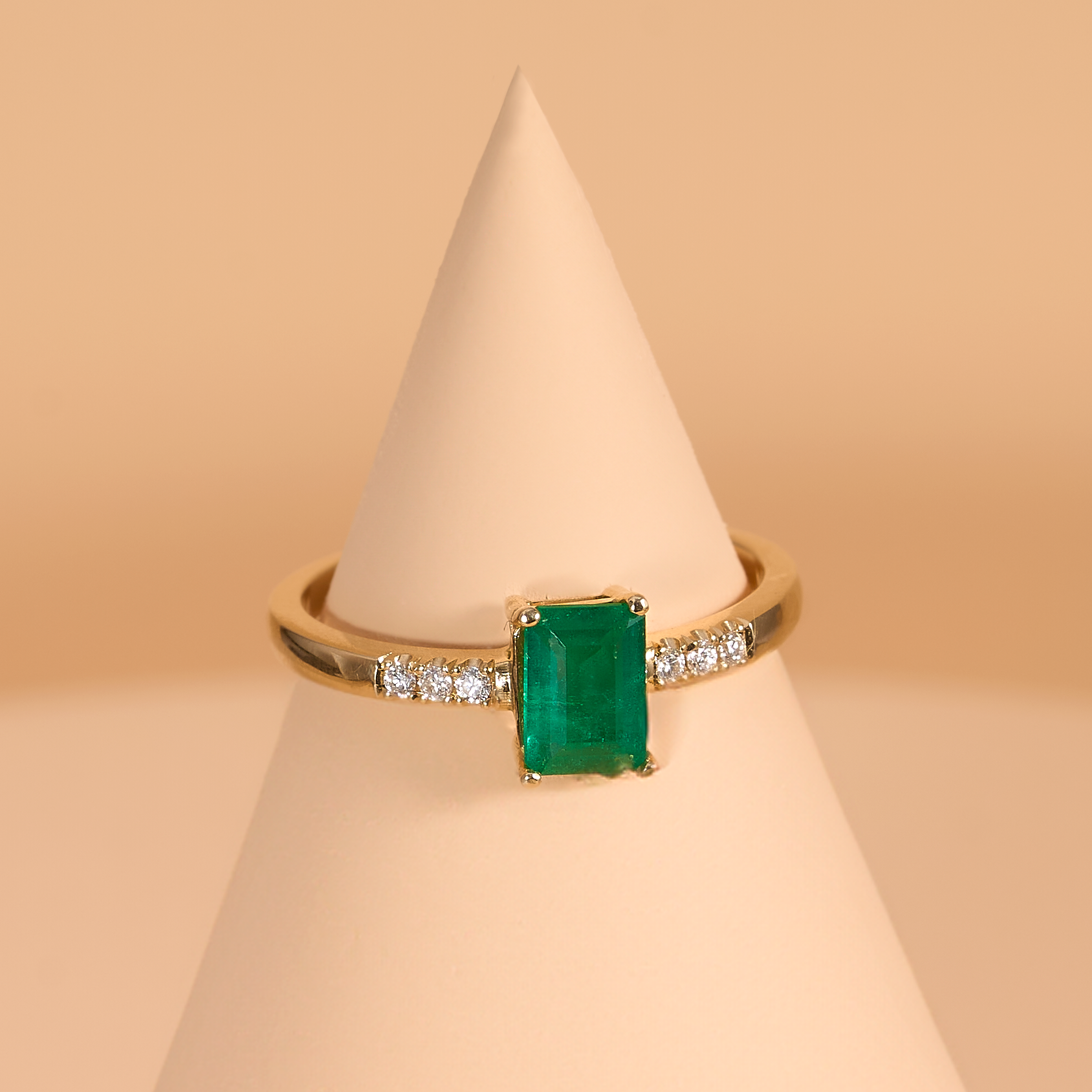 1 Natural Emerald – 0.80 carat weight, 6 Diamonds – 0.60 carat weight, 18K Yellow Gold