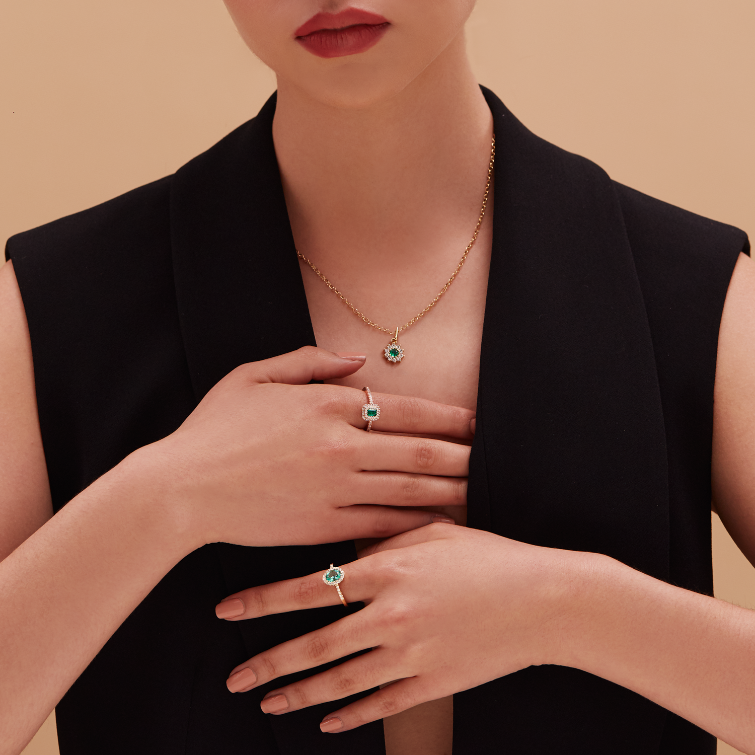 1 Natural Emerald – 0.62 carat weight, 60 Diamonds – 0.60 carat weight, 18K Rose Gold