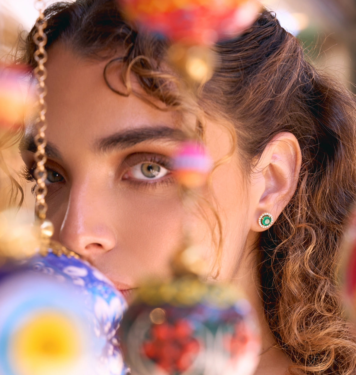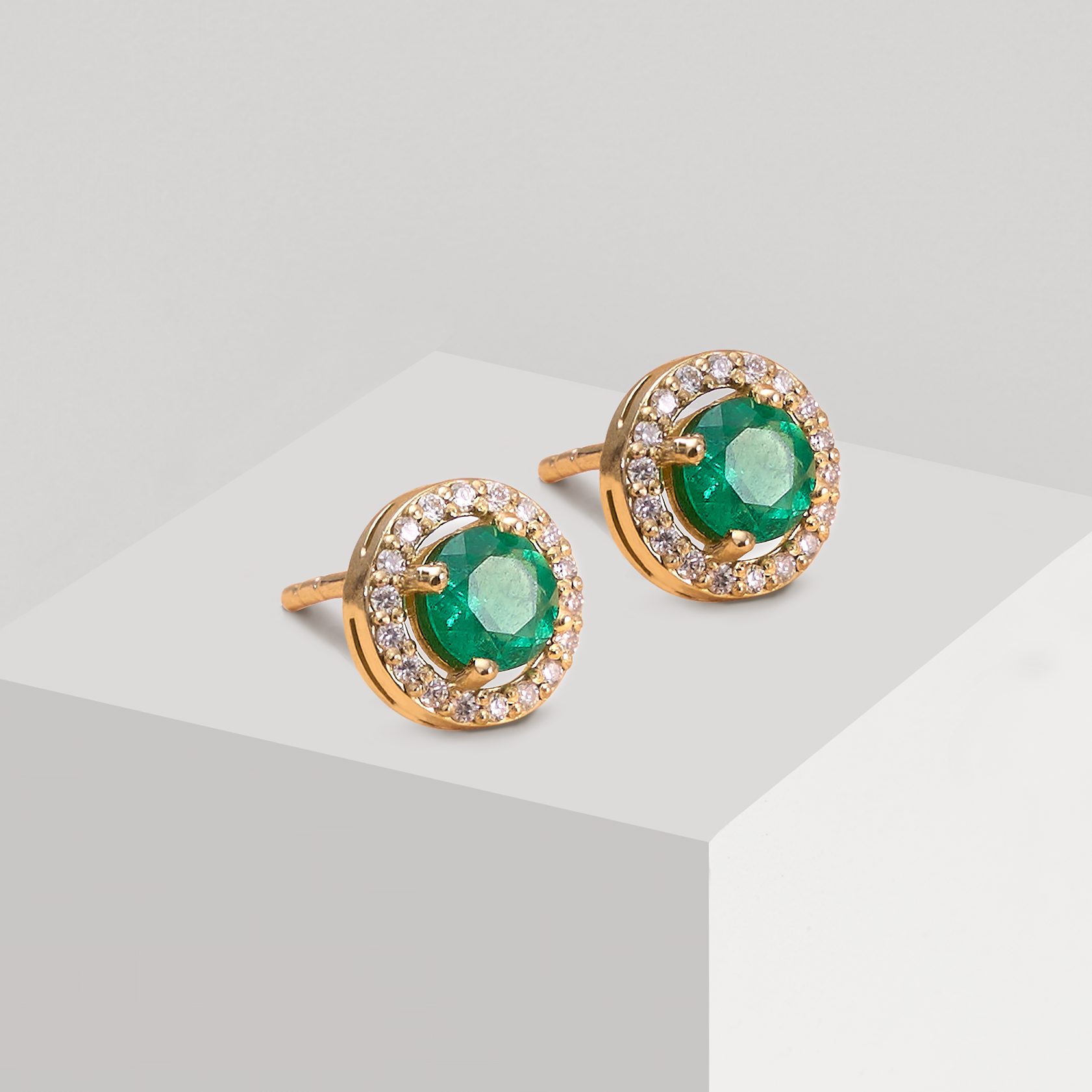 2 Natural Emeralds (3.7mm) – 0.40 carat weight, 32 Diamonds – 0.32 carat weight, 18K Yellow Gold