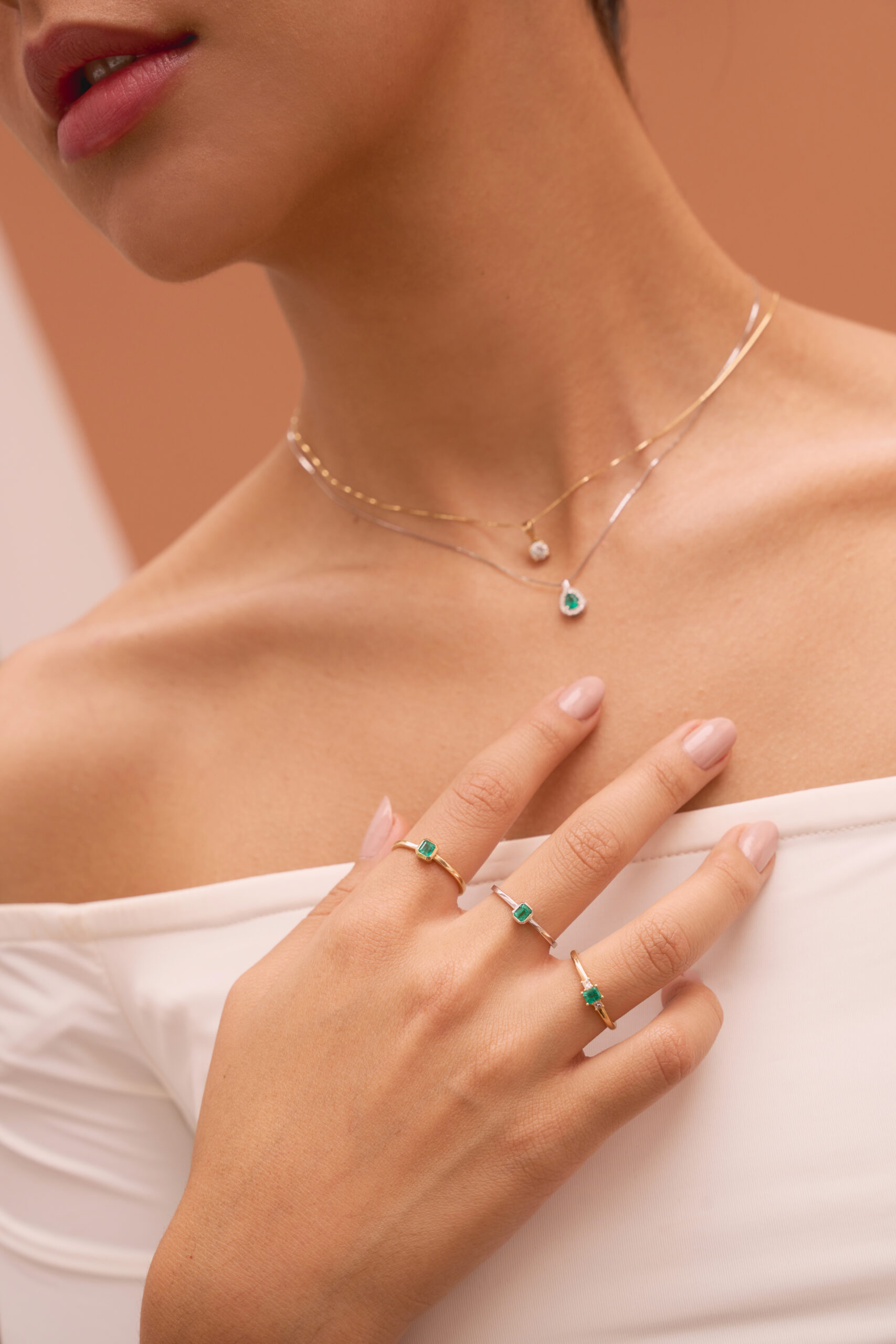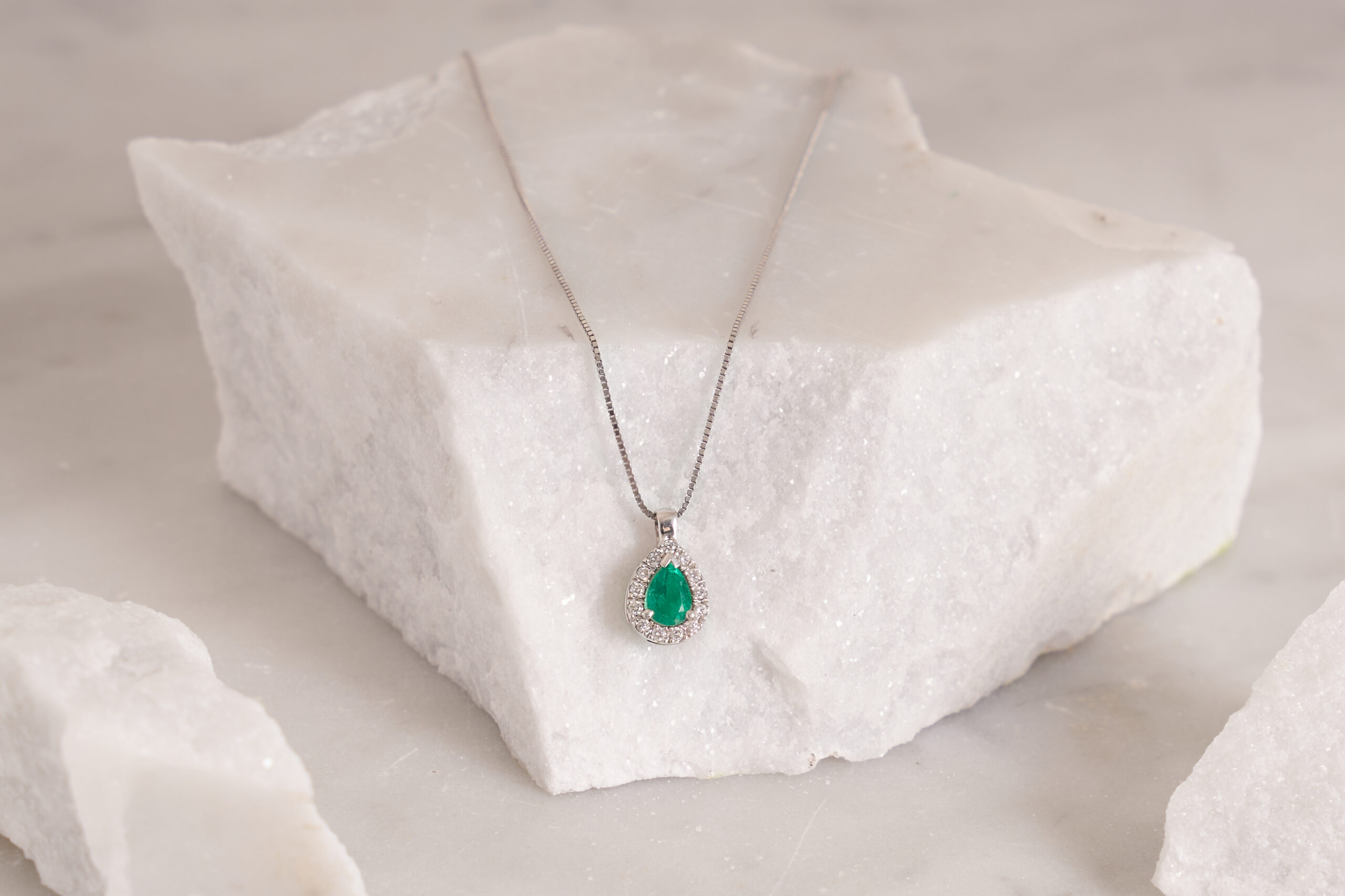 1 Natural Emerald – 0.35 carat weight, 13 Natural Diamonds – 0.13 carat weight, * Chain included