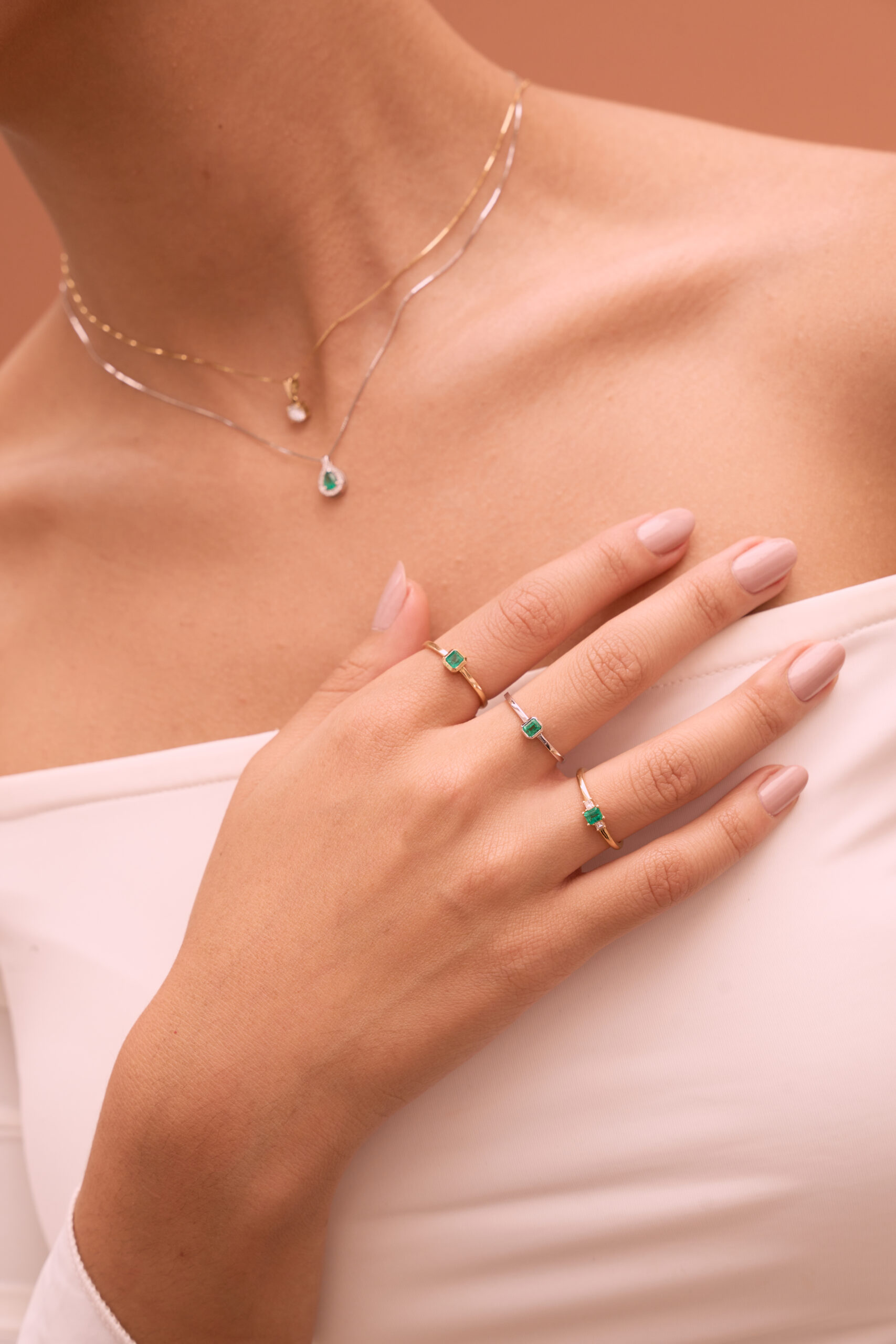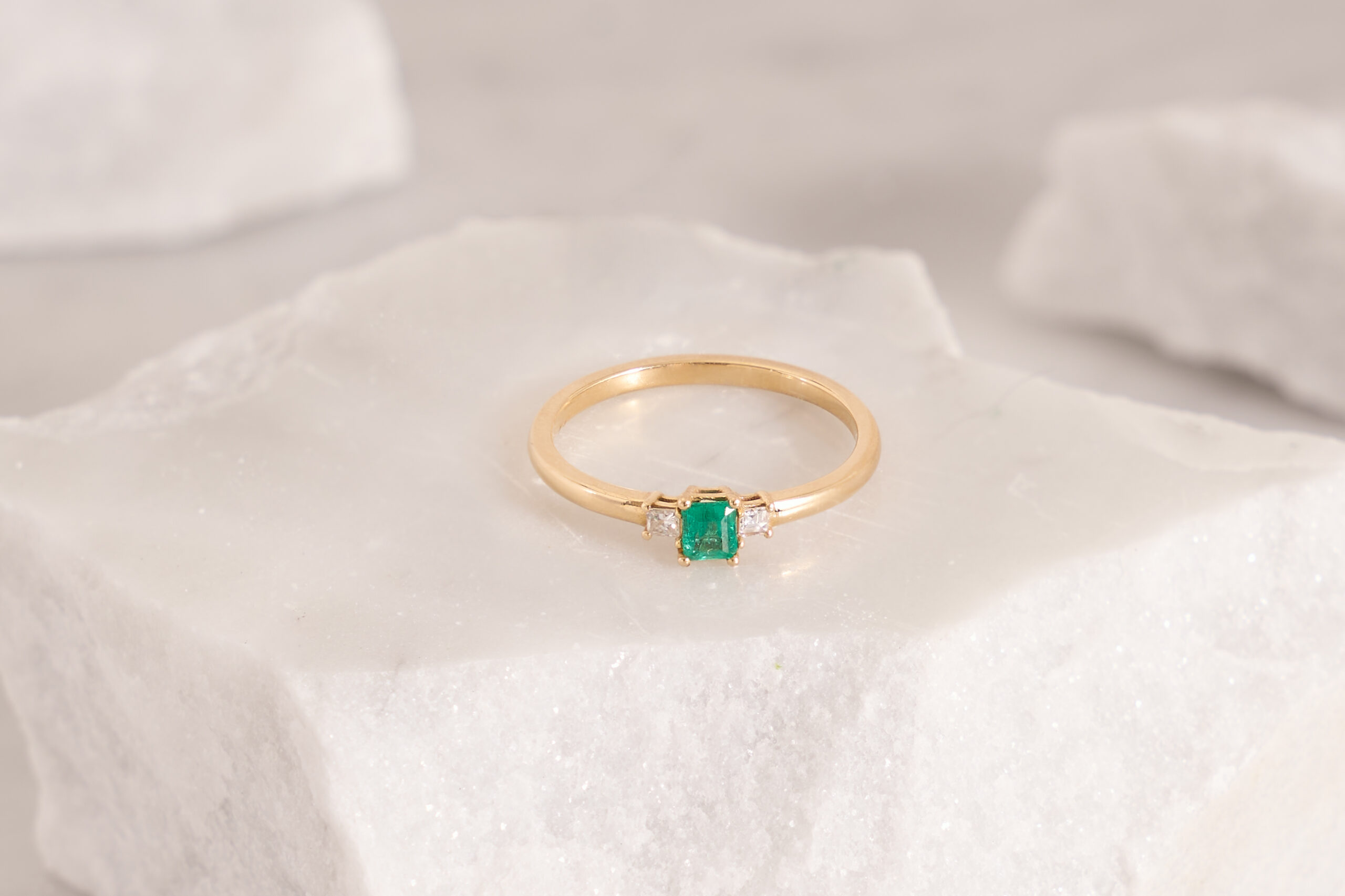 1 Natural Emerald – 0.17 carat weight, 2 Diamonds – 0.12 carat weight, 18k Yellow Gold
